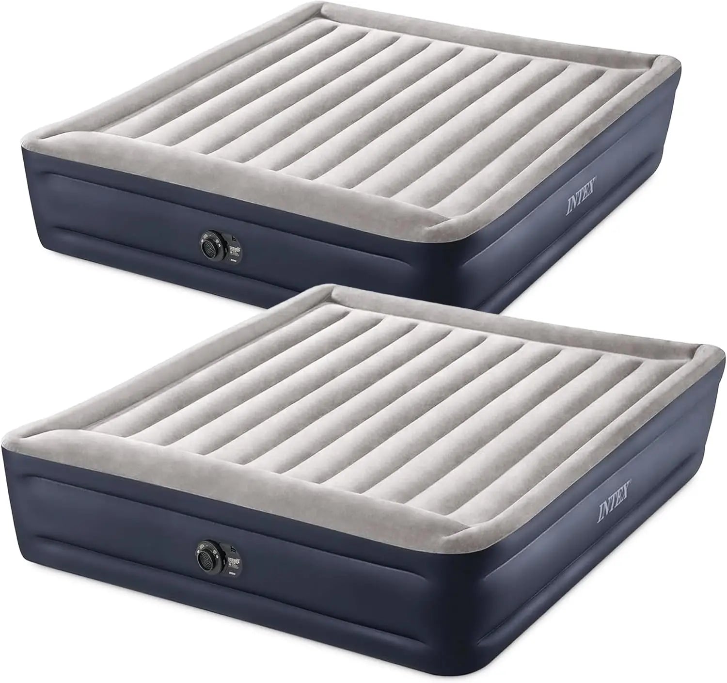 This king-size air mattress, featuring durable Fiber-Tech construction and a built-in pillow, offers firm support and comfort. Its velvety soft top is ideal for two people, while the raised 16.5-inch design and reinforced edges ensure stability. The powerful internal pump allows for quick inflation in about 3 minutes, and a carrying bag is included for easy transport and camping. The mattress measures approximately 72 x 80 x 16.5 inches and 2 mattresses are included.