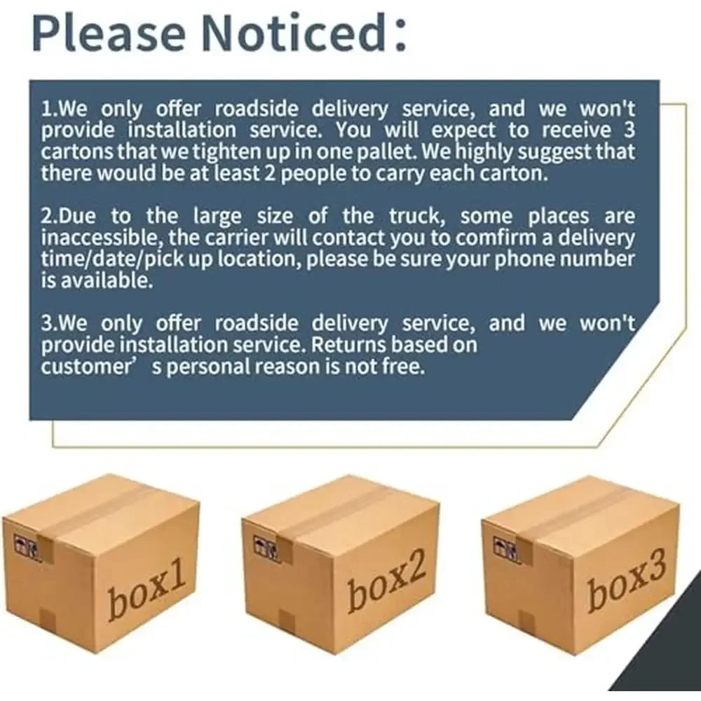 - Please NOTE: Expect to receive up to 3 parcels. Setup not provided. Assistance with parcels recommended.
