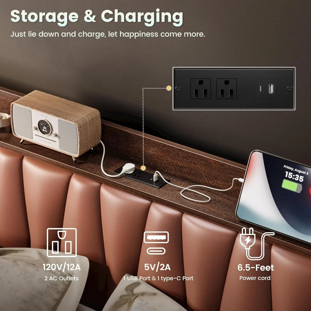 - Headboard features a built-in charging station with two AC outlets, one USB port, and one Type-C port for easy device charging.