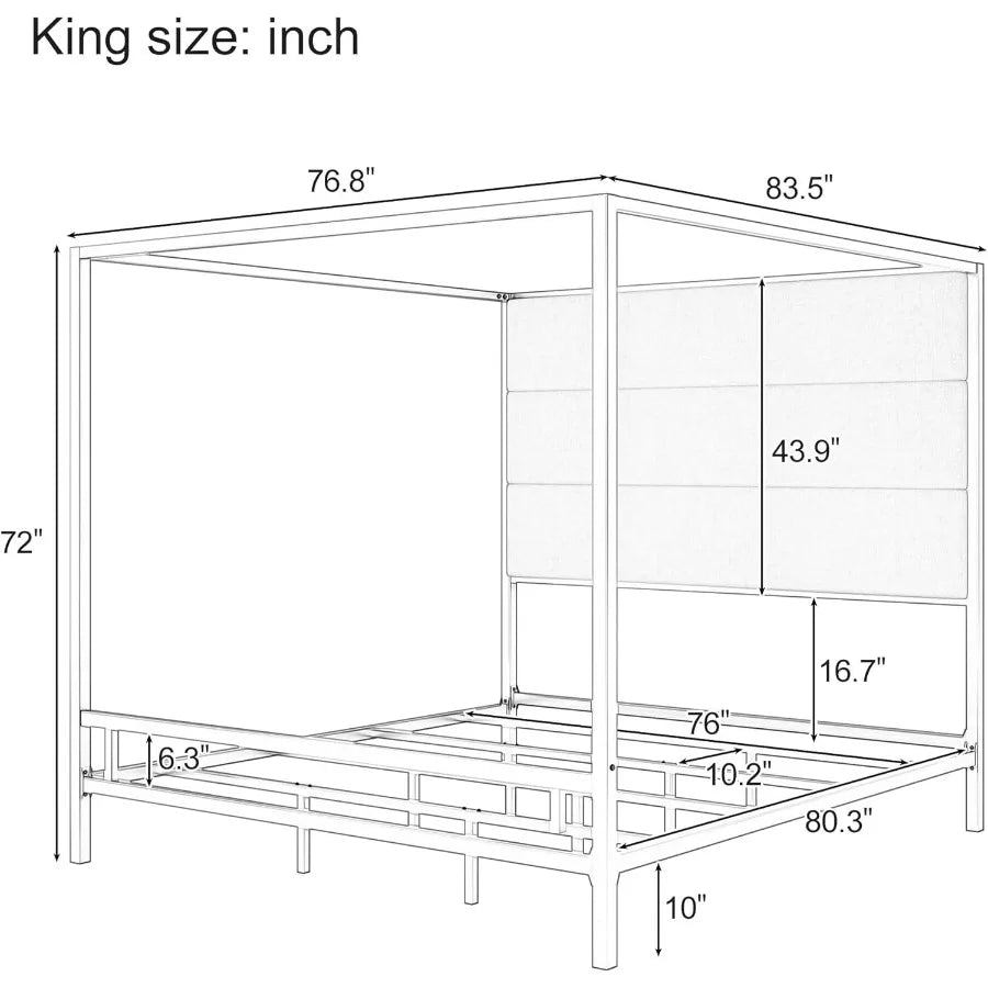 This elegant Gold Canopy Bed features a striking modern design with a tall linen fabric upholstered headboard and sturdy metal four-poster frame. Its luxurious gold finish adds sophistication, making it a standout piece for any bedroom. Designed to accommodate a king-size mattress, this bed frame requires a box spring for optimal support and comfort. The clean lines and contemporary silhouette seamlessly blend style with durability, perfect for elevating your sleeping space.